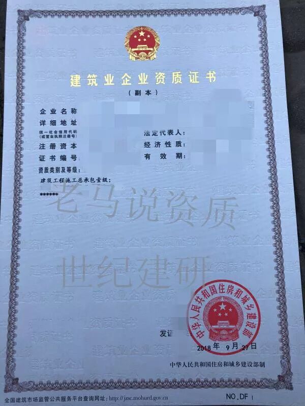 我单位协助企业升级成功,2018年9月27日取得房建一级资质证书